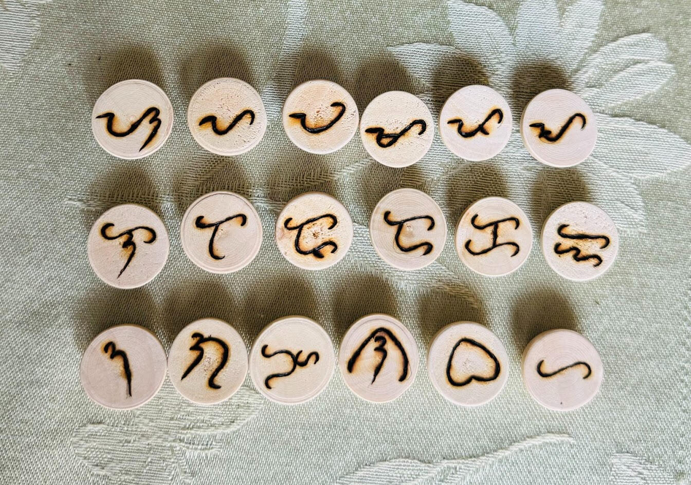 There are two style options for runes: birchwood half-domes or flat wooden discs. The Baybayin characters are woodburned on one side. I can paint, dye, and/or woodburn designs on the blank side at your request.See below for examples-
