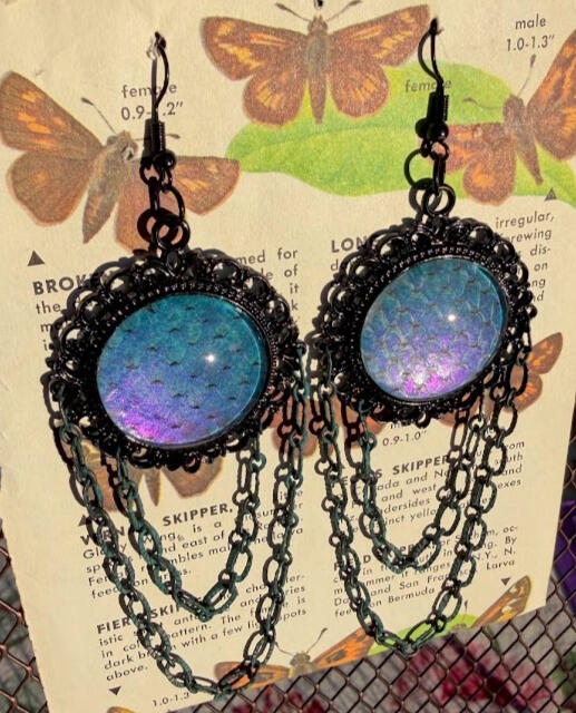 Gold metals w/ beaded iridescent blue accents. Gold fish hooks. Approx 3" drop. Metallic blueshift snake shed. $30