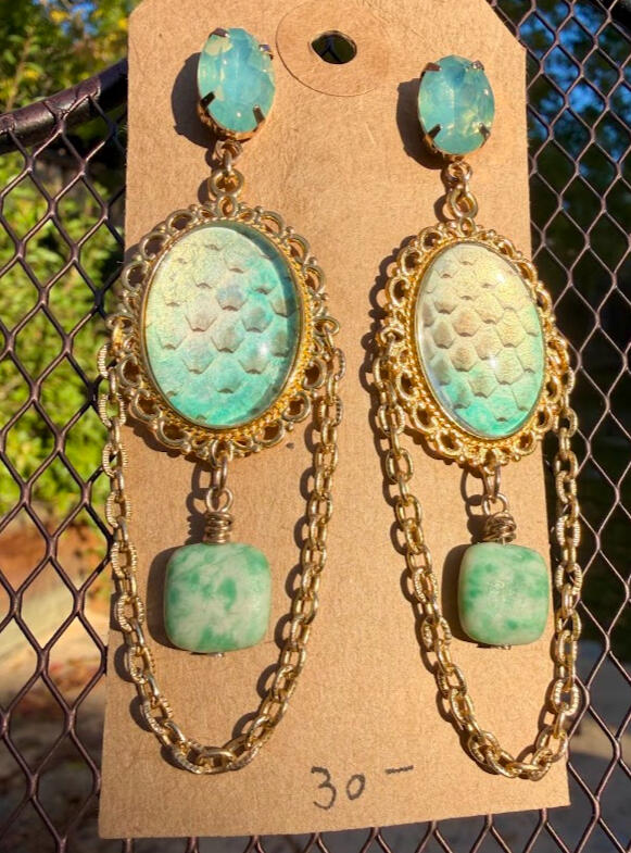 Gold metals w/ amazonite beads and faux gem studs. Metallic shift cream to seafoam green snake shed. Approx 3.5" length. $30