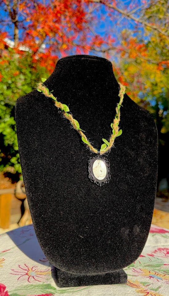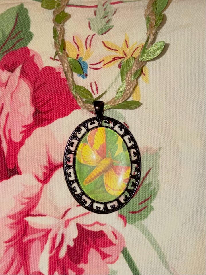 Rosy Maple Moth Twine Necklace. 2" pendant. 20" twine length w/ adjustable chain for optional extension. $30