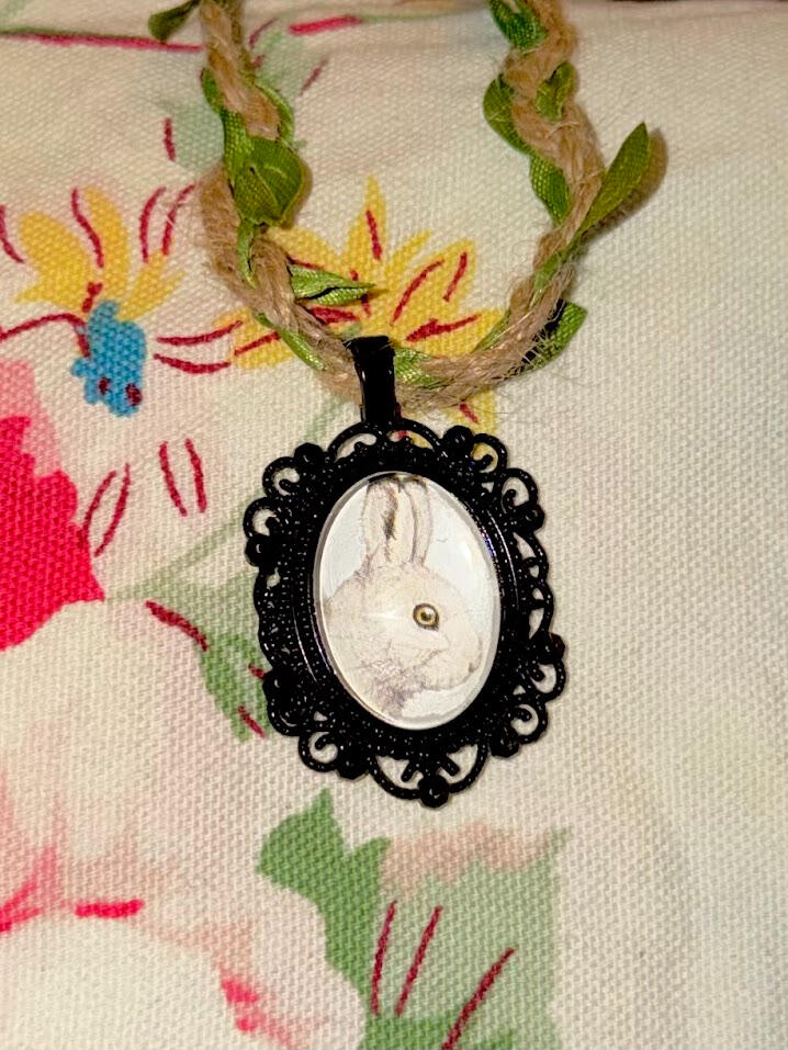 White Rabbit w/ Black Tipped Ears, Twine Necklace. 1" pendant. 18" twine length w/ adjustable chain for optional extension. $25